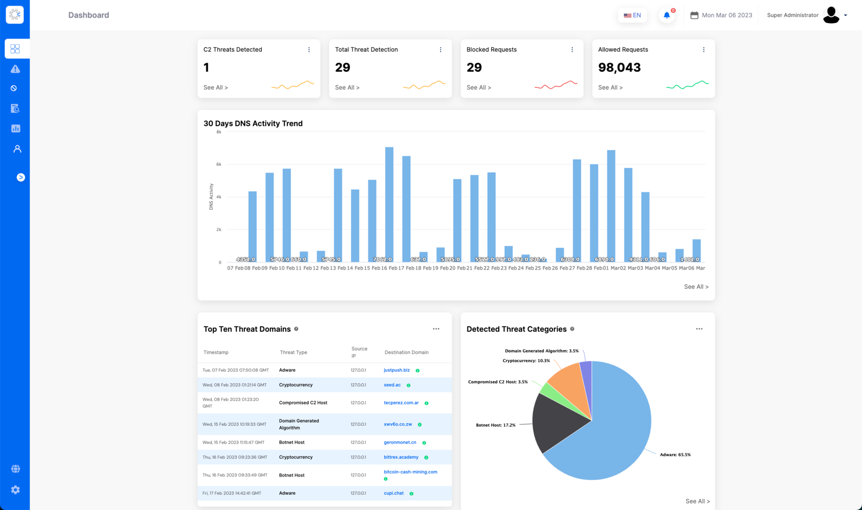 シンプルなダッシュボード、脅威リストによりDNSの通信状況をわかりやすく可視化します。